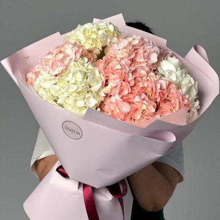 Авторская композиция из гортензий, роз и ранункулюсов в шляпной коробке