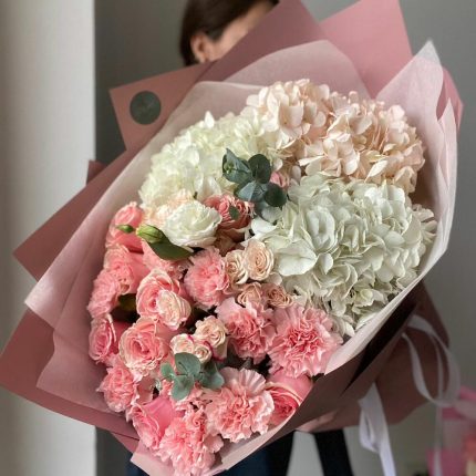 Большой букет с французскими розами, пион кустовой розой и гортензией