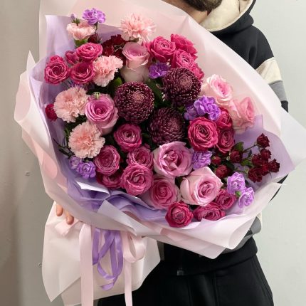 Букет из гортензии, гвоздик, гиперикума, эустомы, роз, эвкалипта и фисташки в плетеной корзине “Ариадна”