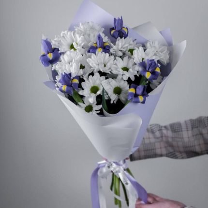 Цветы в коробке с ирисами,тюльпанами, розами,эустомой,хлопком и ягодами вибурнума