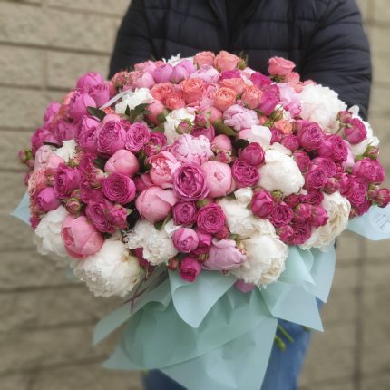 Бархатный цилиндр из голубых диантусов, розовых пионов и ароматной маттиолы