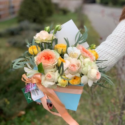 Цветы в большой коробке: садовые розы, лизиантус, маттиола, тюльпаны