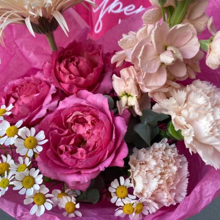 Нежная воздушная композиция комплимент с кустовой пион розой, гипсофилой и лизиантусом