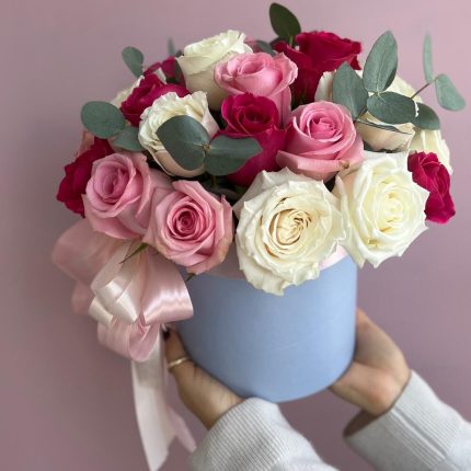 Шляпная коробка с пионовидными лилиями, розами и голубым оксипеталумом