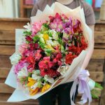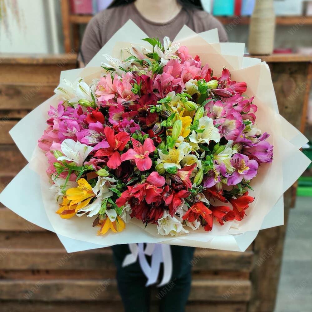 Роскошный букет разноцветной альстромерии с оформлением порадует получателя своими красками. Подари любимой красивый букет ярких цветов