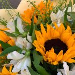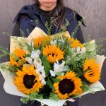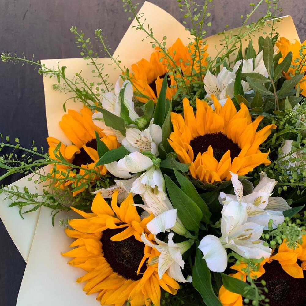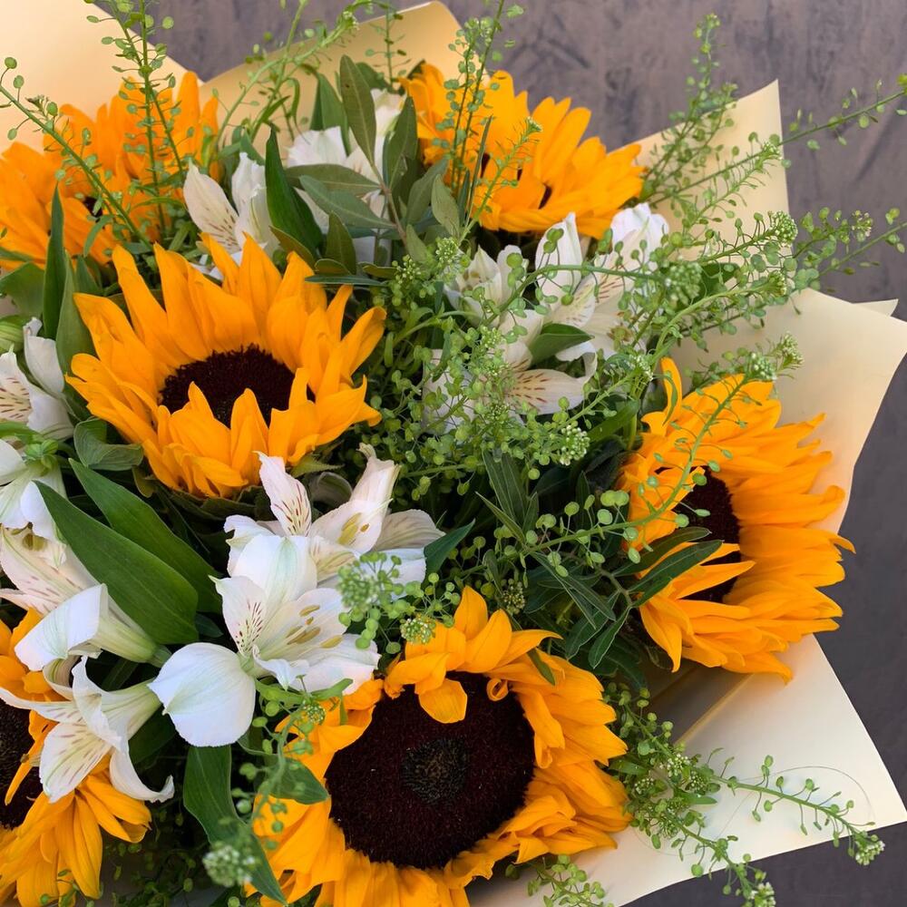 Букет подсолнухов с альстромериями и декоративной зеленью
