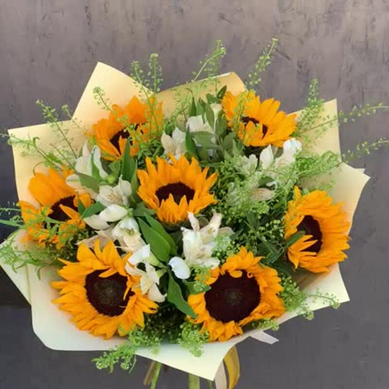 Подсолнух – 7 шт.Альстромерия – 5 шт.Тласпи Green Bell – 4 шт.Фисташка – 5 шт.Упаковка дизайнерская – 1 шт.Лента атласная – 1 шт.