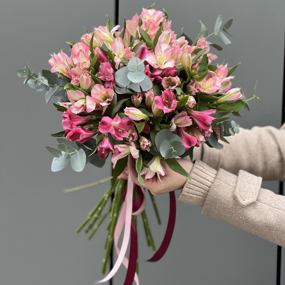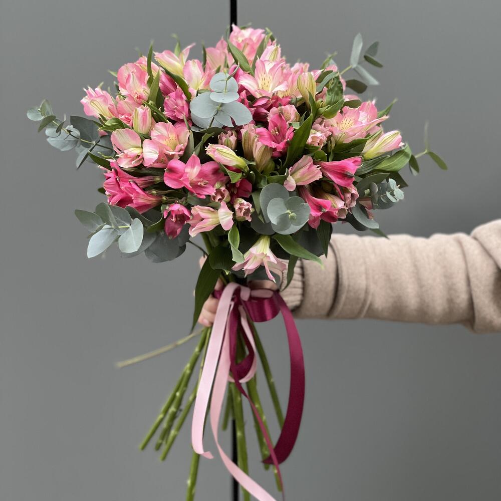 Альстромерия – 15 шт. Эвкалипт – 2 шт. оформление – ленты – 1 шт.