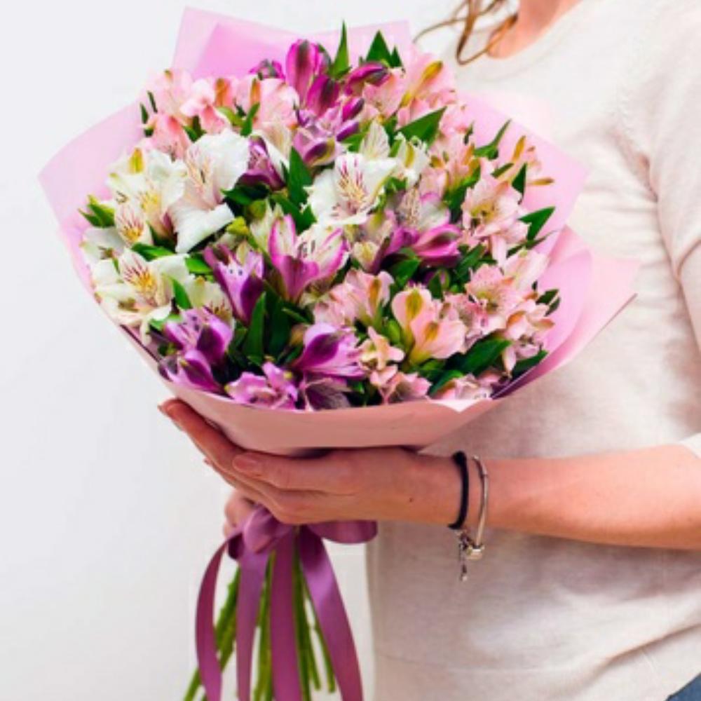 Альстромерия – 19 шт.Упаковка дизайнерская – 1 шт.Лента атласная – 1 шт.