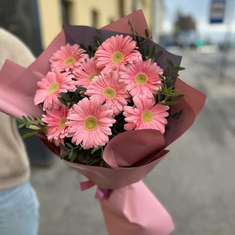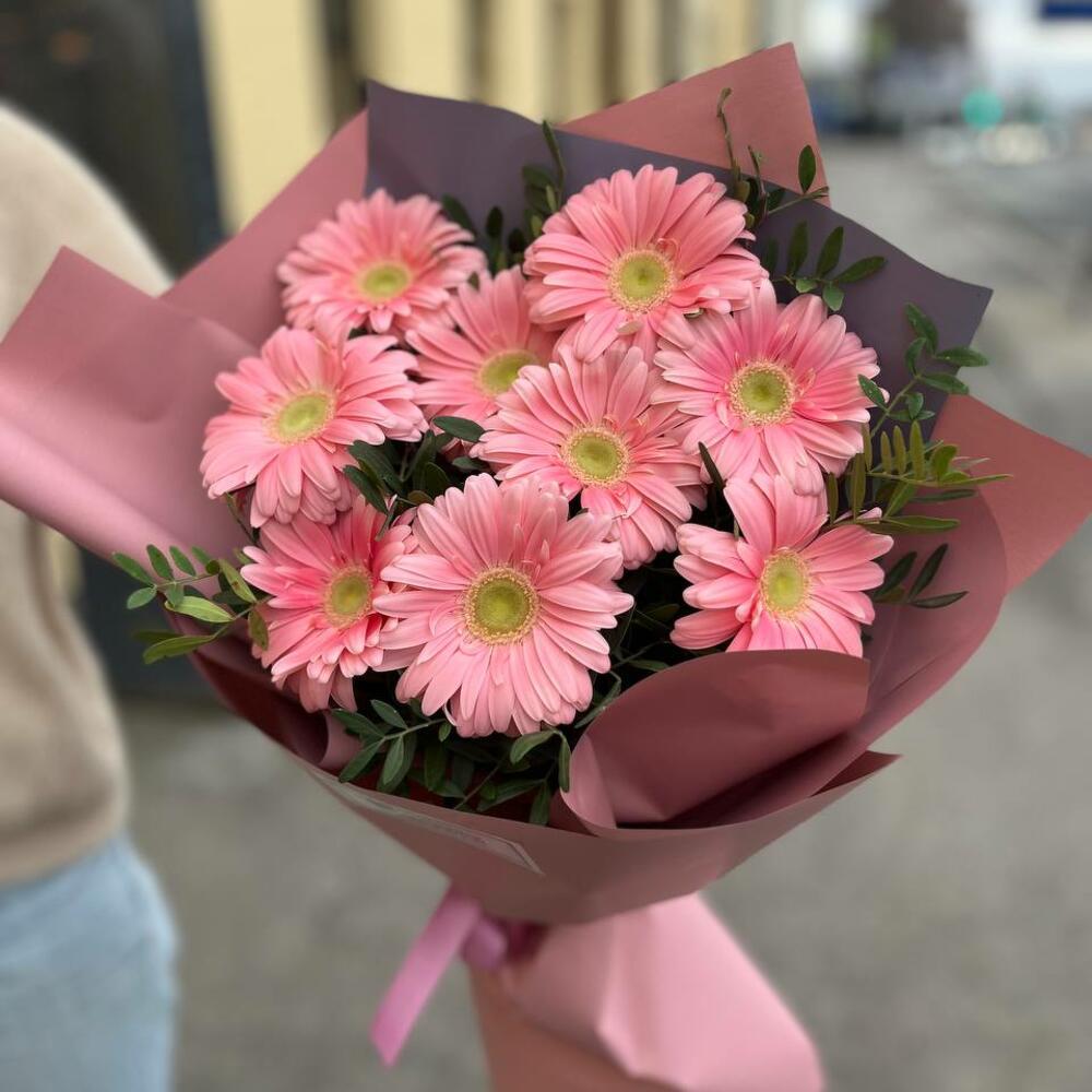 Букет из 9 розовых мини гербер в упаковке “Сью”