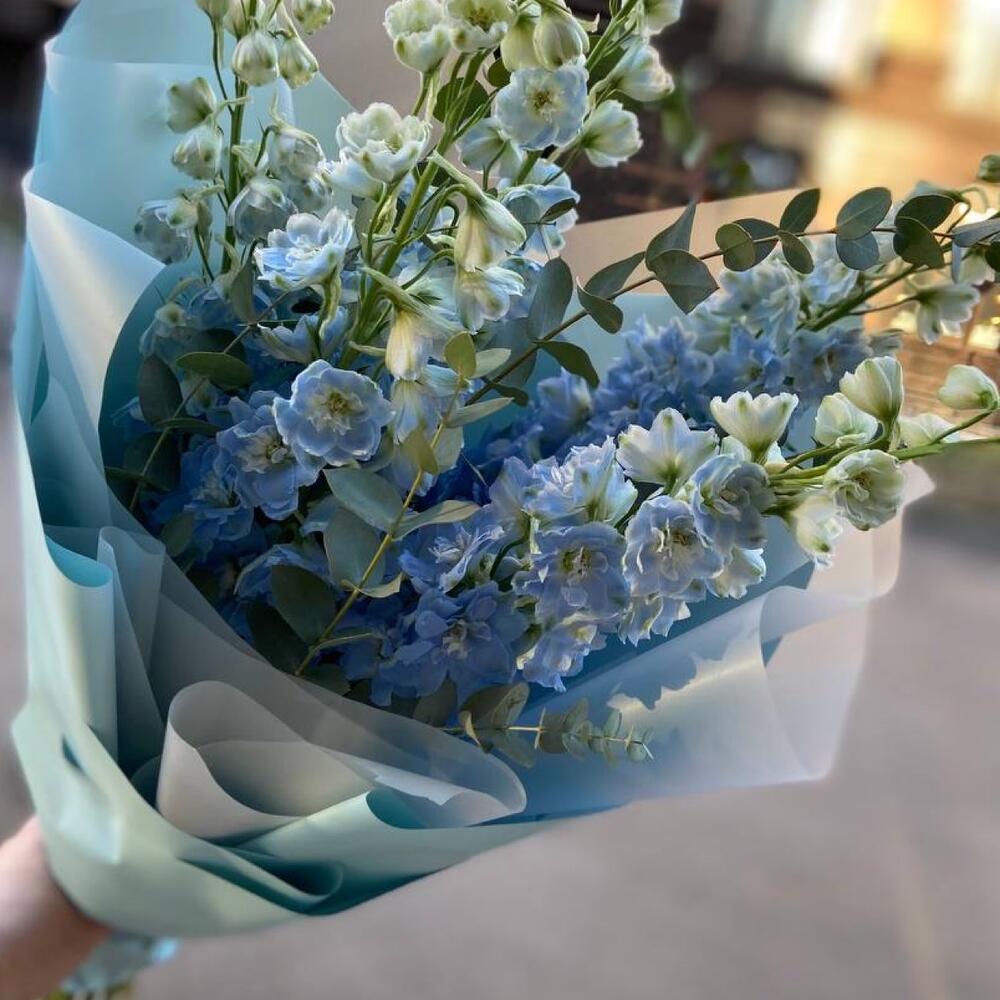 Дельфиниум – 5 шт.Эвкалипт – 3 шт.Лента атласная – 1 шт.Упаковка дизайнерская – 6 шт.