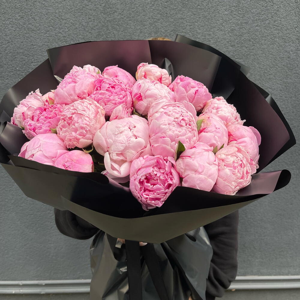Голландська півонія сорту Sarah Bernhardt в чорному стильному пакуванні.