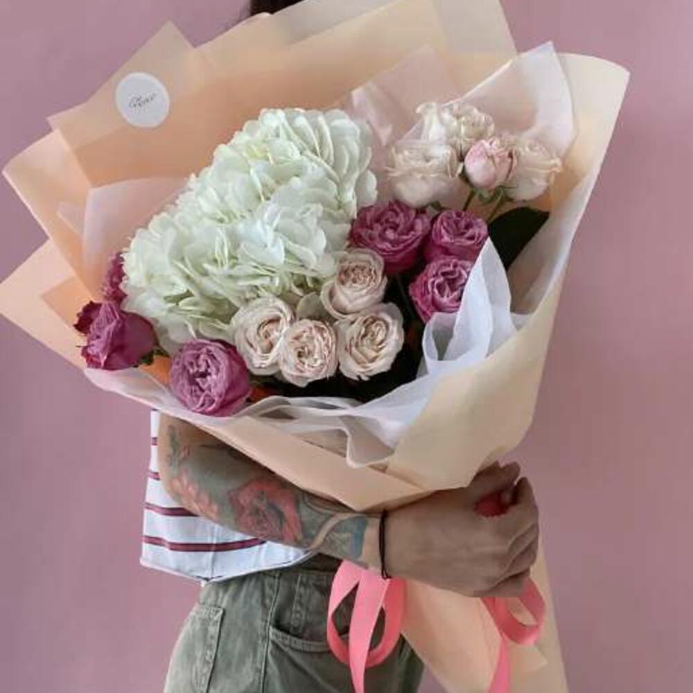 Букет из пионов, пионовидной розы, гортензии
