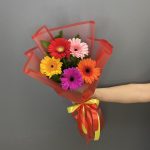 Рускус – 6 шт.Лента атласная – 1 шт.Гербера мини – 5 шт.Упаковка дизайнерская – 1 шт.