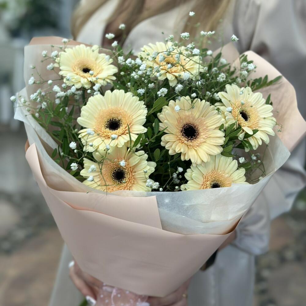 Гипсофила – 2 шт. Гербера – 7 шт. Пистация – 5 шт.