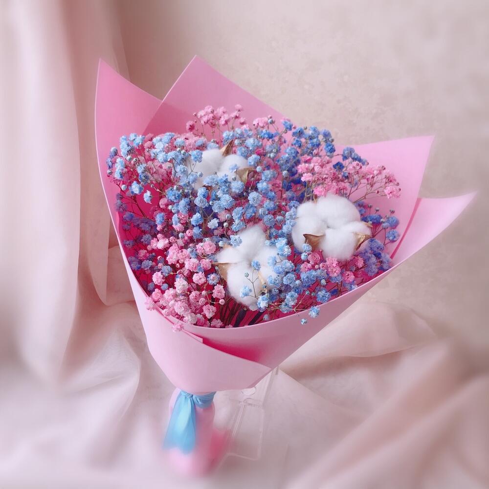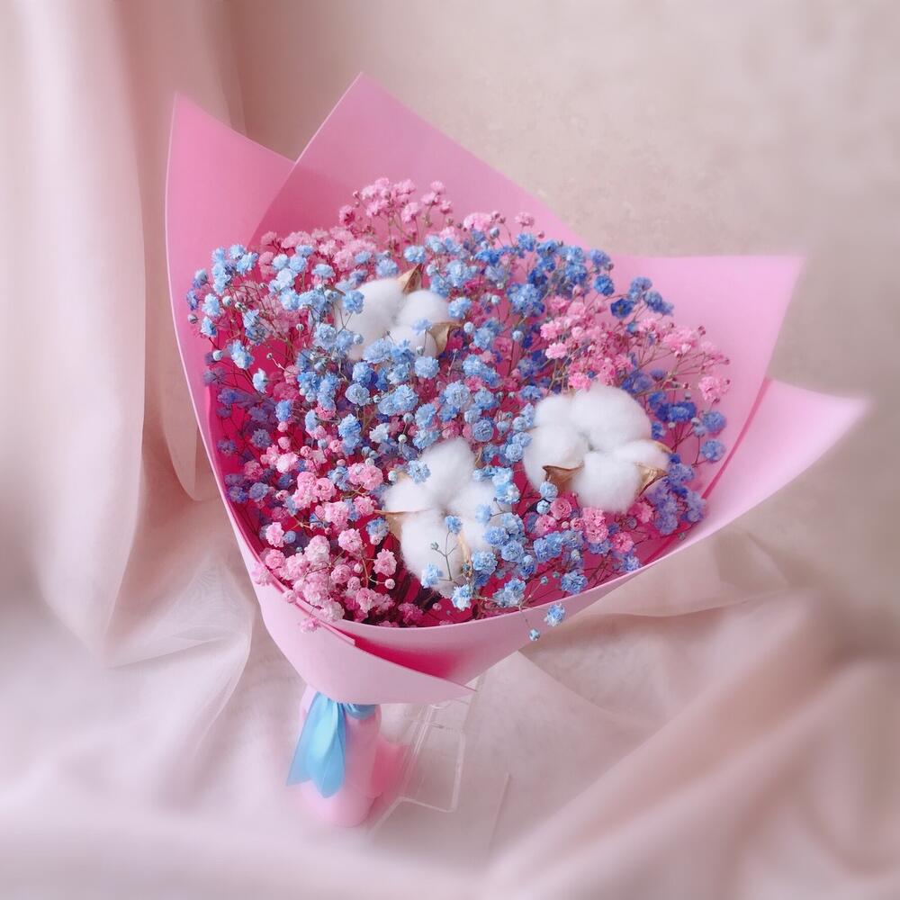 Хлопок – 3 шт.Лента атласная – 1 шт.Упаковка дизайнерская – 1 шт.гипсофила радужная – 3 шт.
