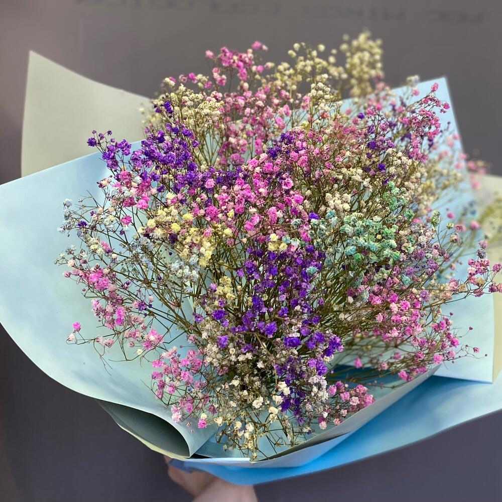 «Лавандовое созвездие» Букет из розы, гвоздики, статица и хлопка