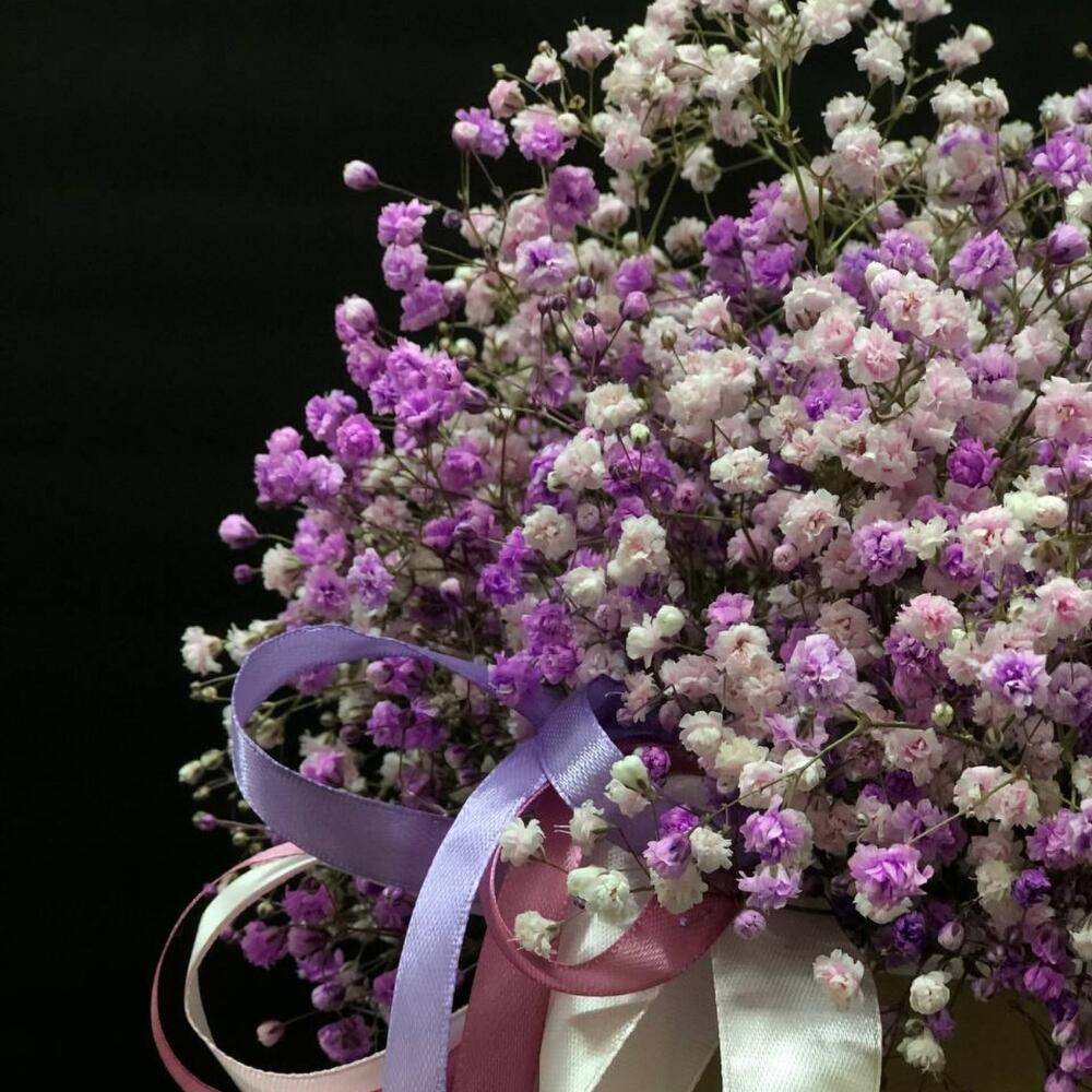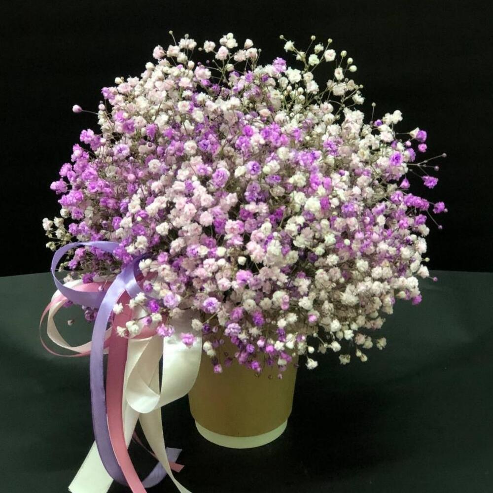 “Сиреневый туман” – композиция из гипсофилы в шляпной коробке
