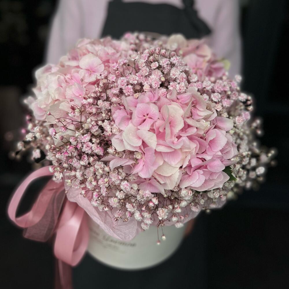 шляпная коробочка l – 1 шт.Флористическая губка (оазис) – 1 шт.Тишью – 1 шт.Атласная лента – 1 шт.Гортензия – 3 шт.Гипсофила – 7 шт.