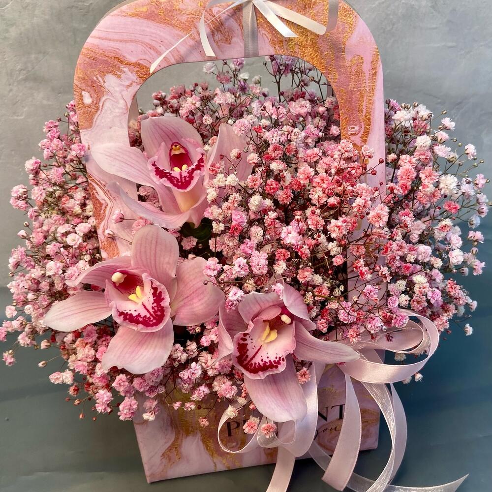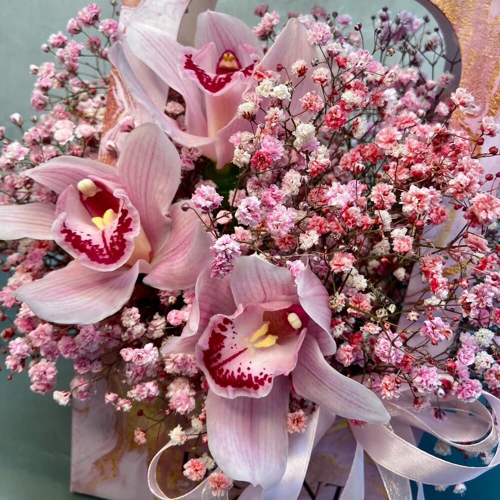 Гипсофила – 6 шт.Орхидея Цимбидиум – 3 шт.Лента атласная – 2 шт.Оазис флористический – 1 шт.Сумка крафт – 1 шт.