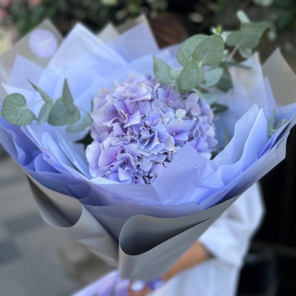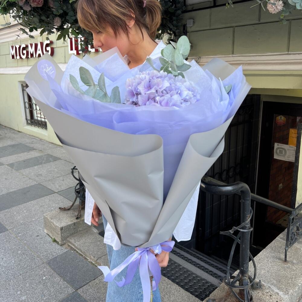 Букет-комплимент с сиреневой гортензией и эвкалиптом в серой упаковке