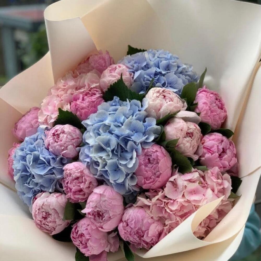 Пион розовый – 20 шт.Гортензия микс – 5 шт.Упаковка дизайнерская – 1 шт.Лента атласная – 2 шт.Открыточка с вашими пожеланиями – 1 шт.хорошее настроение – 100 шт.инструкция по уходу за цветами – 1 шт.коробка переноска – 1 шт.Кризал – 1 шт.