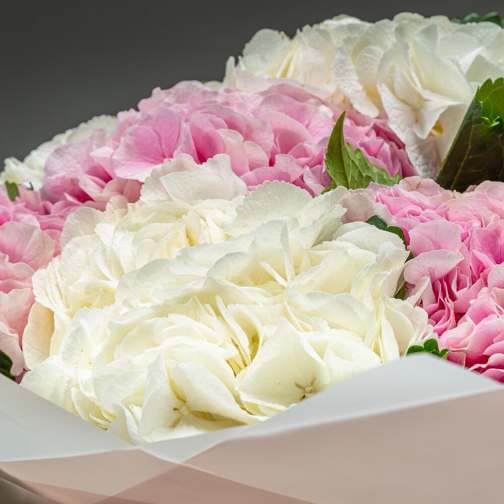 гортензия премиум розовая – 6 шт.гортензия премиум белая – 5 шт.Упаковка дизайнерская – 2 шт.Лента атласная – 2 шт.хорошее настроение – 100 шт.