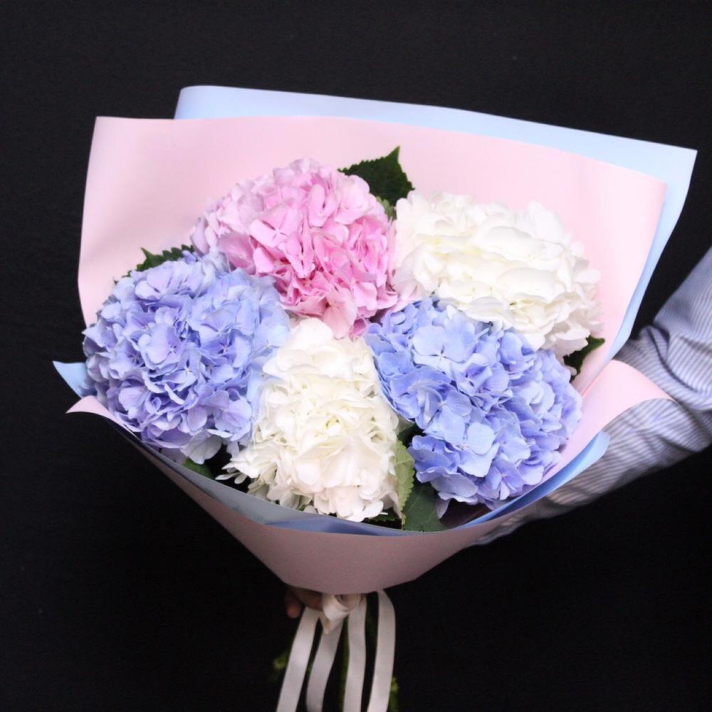 Гортензия – 5 шт.Пленка дизайнерская – 3 шт.Лента атласная – 2 шт.