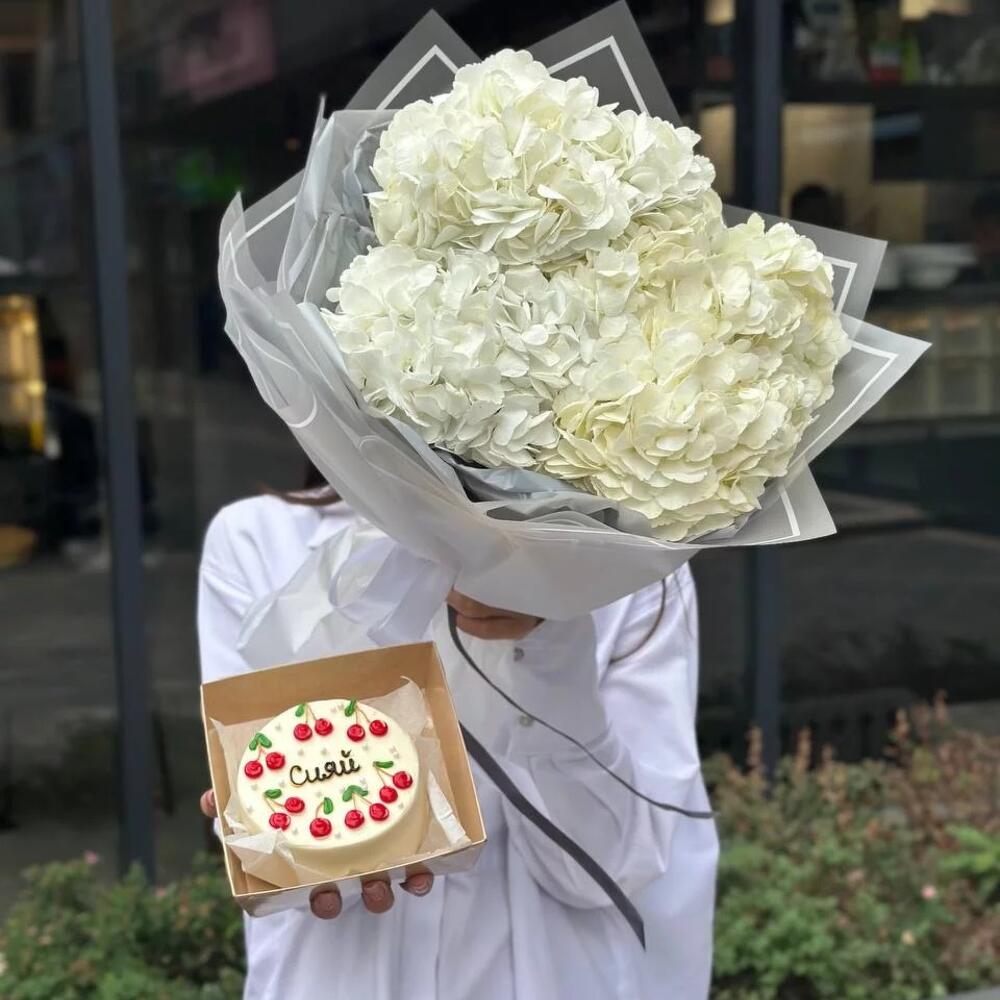 Нежный букет из гортензий с бенто-тортом.