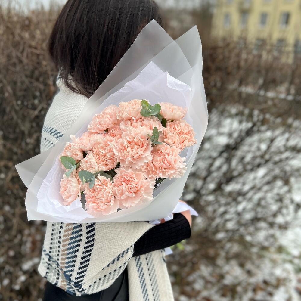 15 нежных гвоздик с эвкалиптом