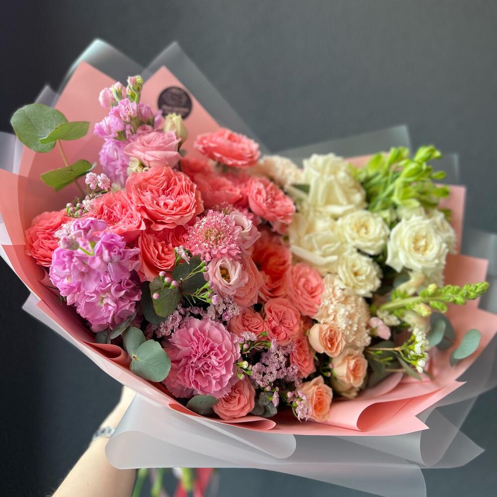 Альстромерия – 1 шт.Лизиантус – 2 шт.Маттиола – 2 шт.Роза кустовая – 6 шт.Скабиоза – 2 шт.Эвкалипт – 2 шт.Роза – 3 шт.Гвоздика – 3 шт.Роза пионовидная – 1 шт.Хамелациум – 2 шт.Атласная лента – 1 шт.декоративная упаковка – 1 шт.