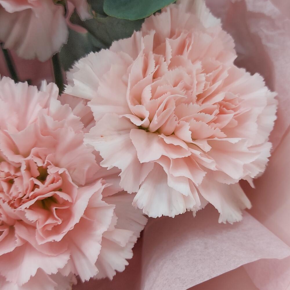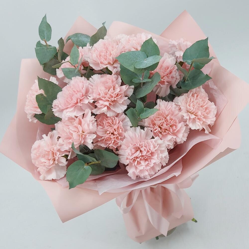 Стильный, ароматный и очень стойкий букет из розовых гвоздик с эвкалиптом. Такой букет всегда уместен и подойдёт для любого повода.