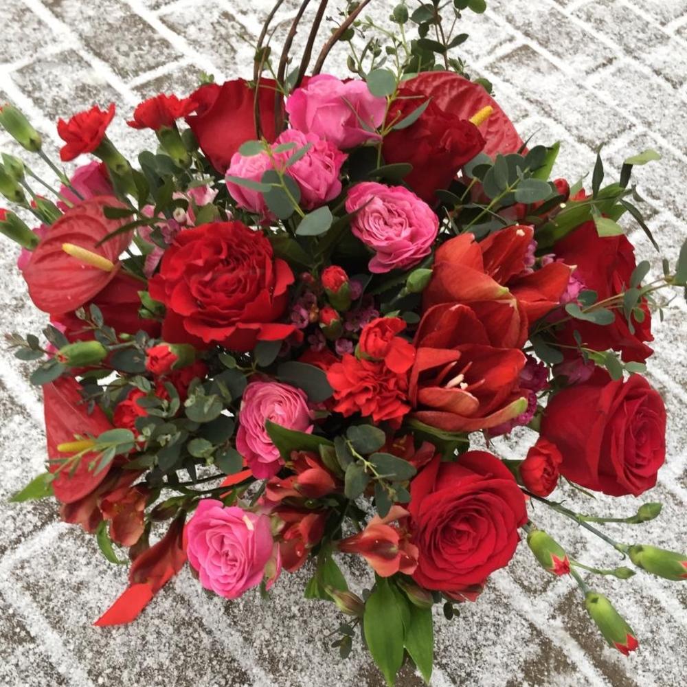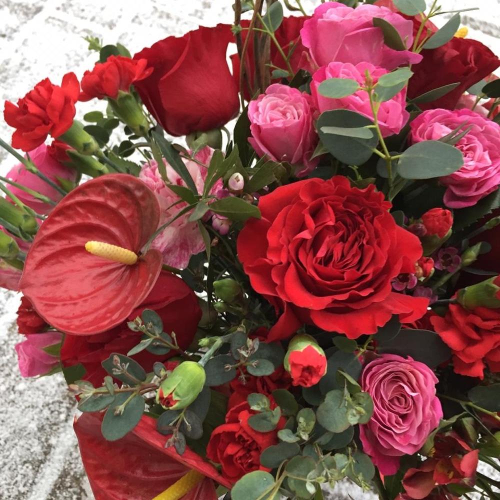 Альстромерия – 3 шт.Амариллис – 1 шт.Антуриум – 3 шт.Ваксфлауэр – 3 шт.Эвкалипт – 10 шт.Роза – 7 шт.Лента атласная – 2 шт.Диантус – 2 шт.Роза кустовая пионовидная – 4 шт.Диантус кустовой – 8 шт.