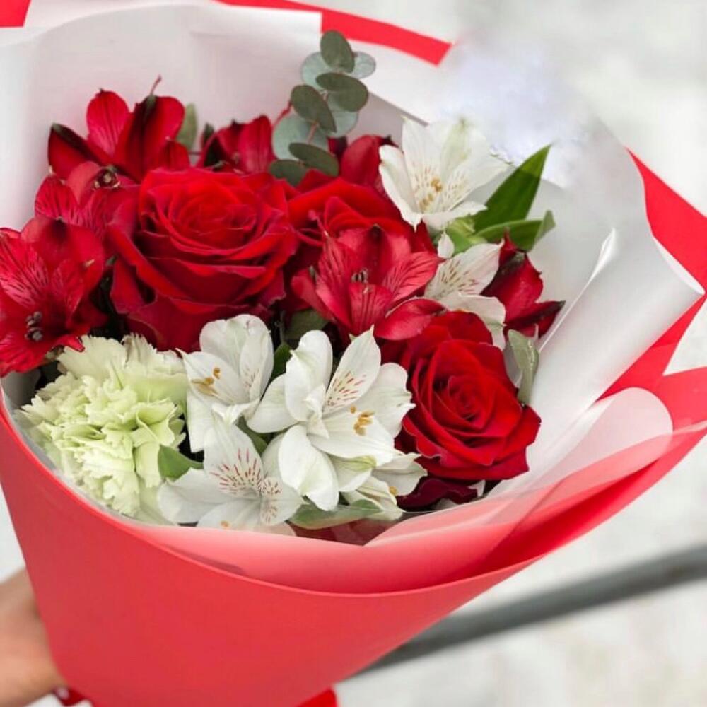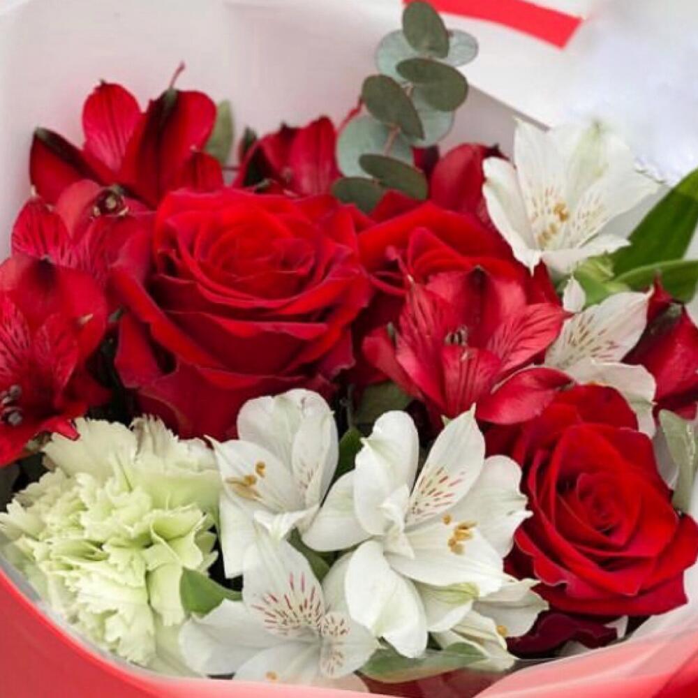 Альстромерия – 3 шт.Эвкалипт – 2 шт.Роза – 3 шт.Лента атласная – 1 шт.Диантус – 1 шт.Фисташка – 2 шт.Упаковка дизайнерская – 2 шт.