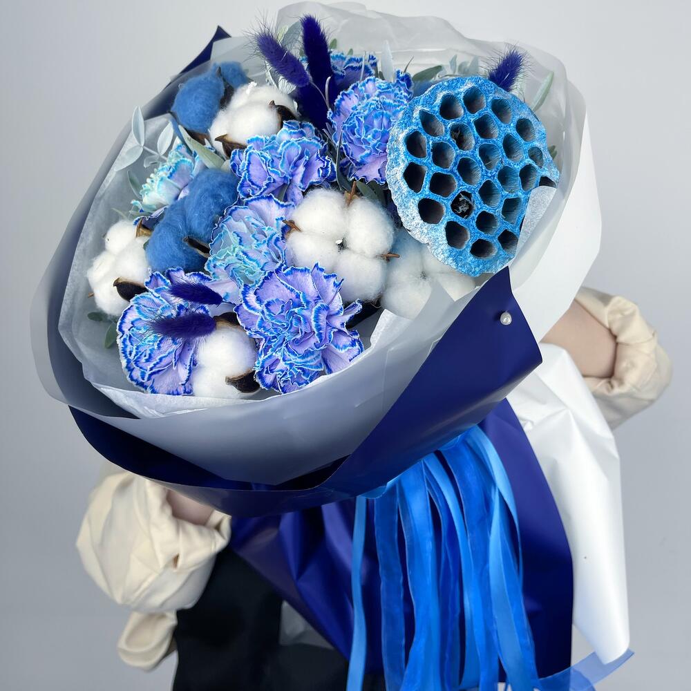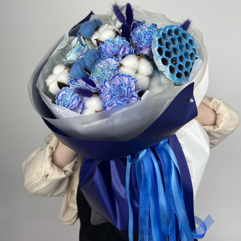 Гвоздика – 7 шт.Хлопок натуральный – 8 шт.Лагурус (сухоцвет) – 7 шт.Лотос (коробочка) – 1 шт.Тишью – 2 шт.Пленка матовая – 2 шт.