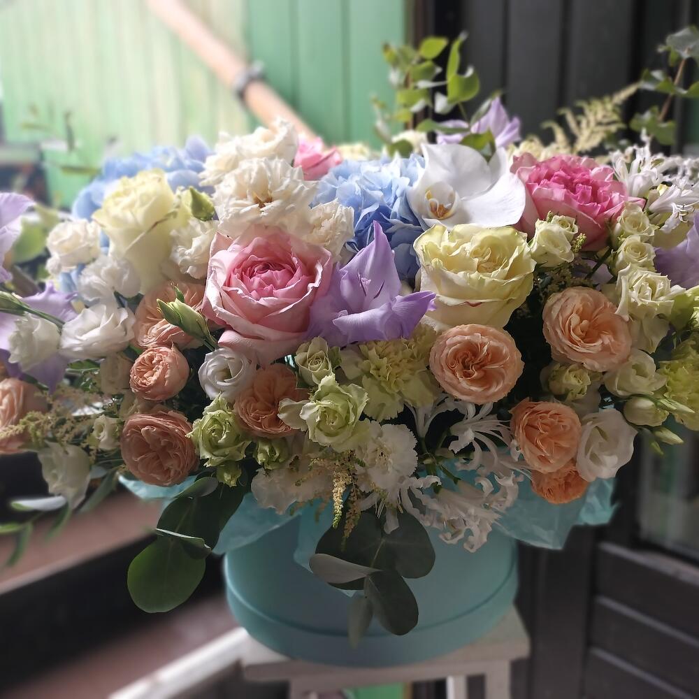 Коробка шляпная – 1 шт.Калька упаковка – 4 шт.оазис флористический кирпич – 2 шт.гортензии – 3 шт.Эвкалипт – 10 шт.Лизиантус – 5 шт.Астильба – 5 шт.Гладиолус – 3 шт.розы кустовые пионовидные – 7 шт.розы кустовые – 10 шт.Нерина – 5 шт.розы пионовидные – 7 шт.орхидея – 3 шт.Диантус кустовой – 7 шт.