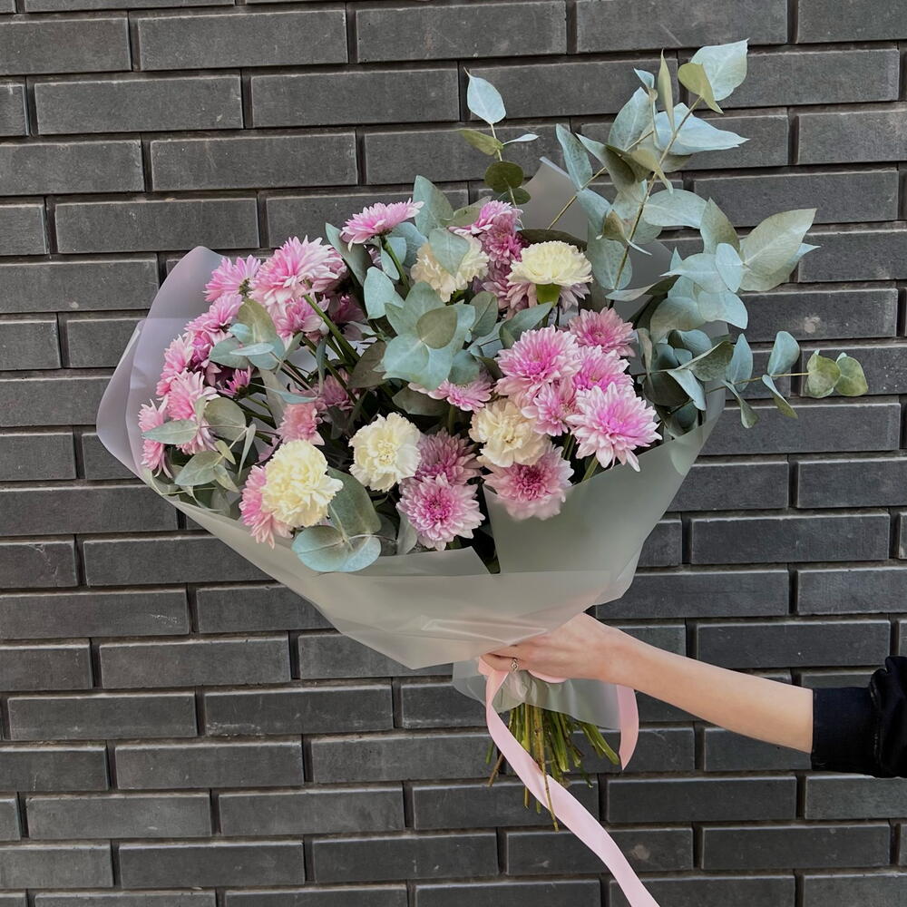 Гвоздики, Лизиантусы, Розы, Тюльпаны