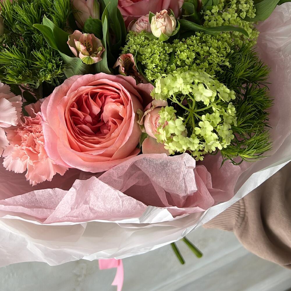 Альстромерия – 2 шт.Кустовая роза – 2 шт.Диантус – 2 шт.Роза пионовидная – 3 шт.Упаковка дизайнерская – 1 шт.грин трикс – 3 шт.