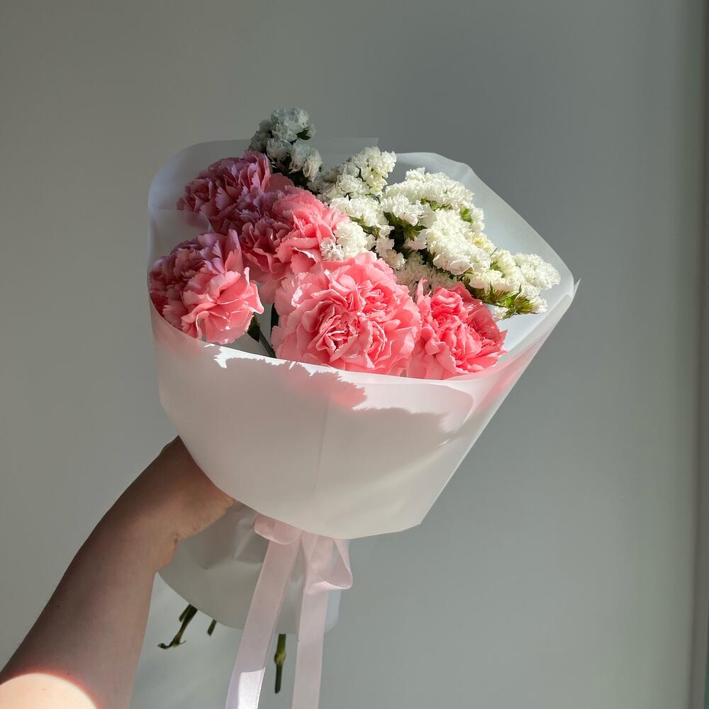 11 нежных гвоздик с эвкалиптом