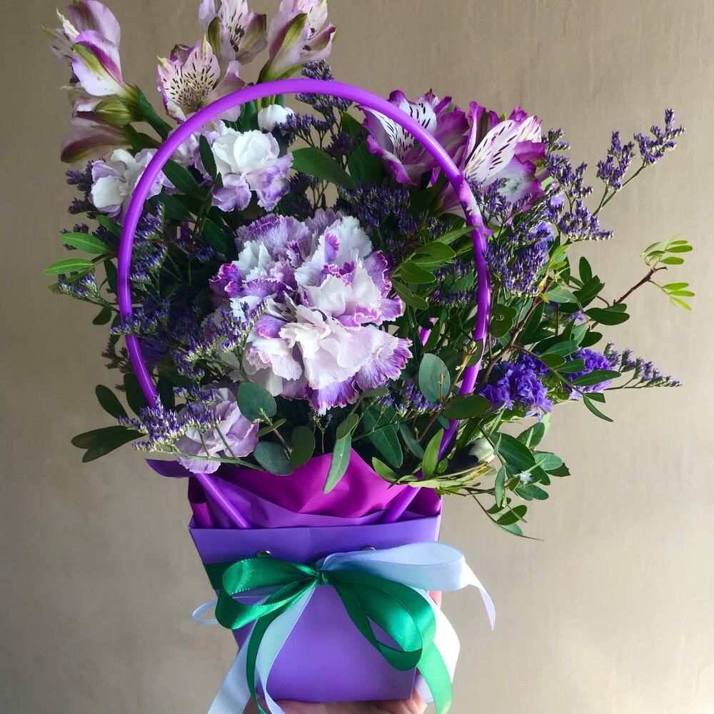Диантус – 3 шт.Альстромерия – 2 шт.Лимониум – 2 шт.Фисташка – 1 шт.Оазис флористический – 1 шт.Сумка – 1 шт.Лента атласная – 2 шт.