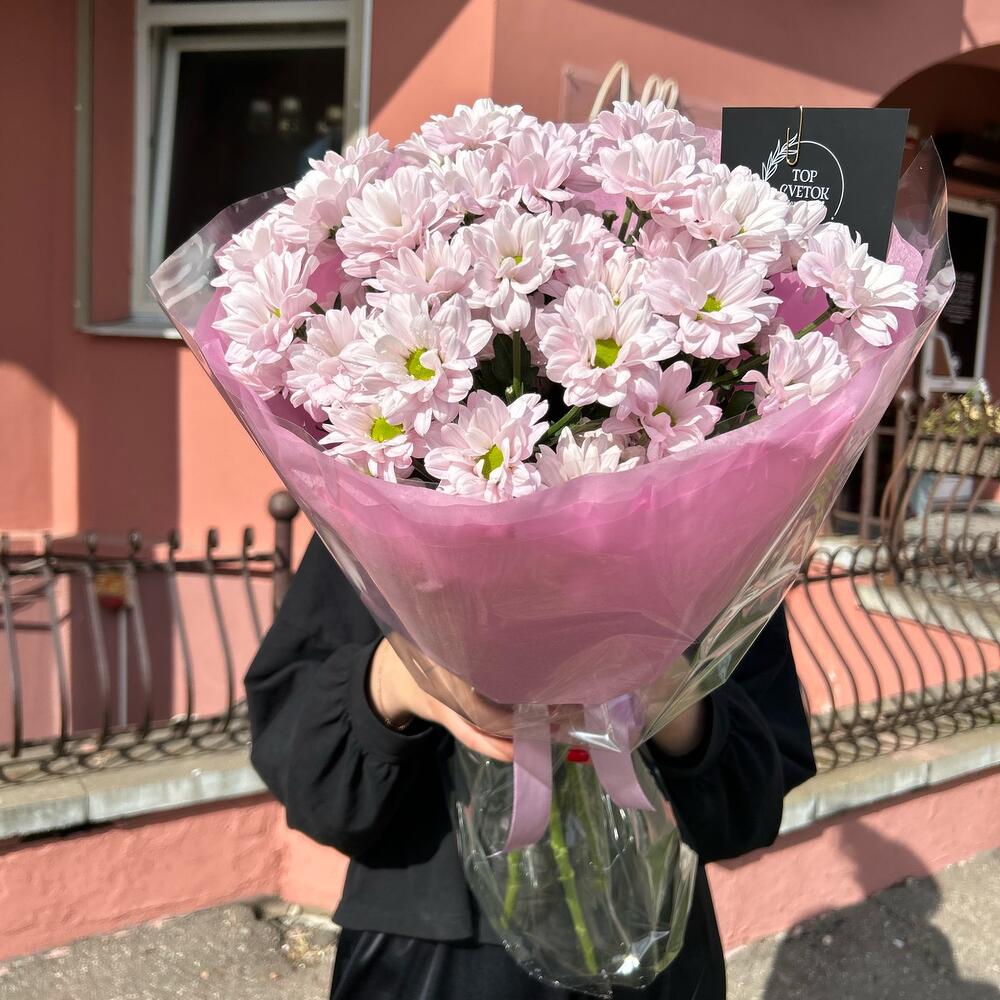 Букет из 5 веток ромашковой хризантемы в дизайнерском оформлении , количество ромашек в букете может достигать 51 шт.