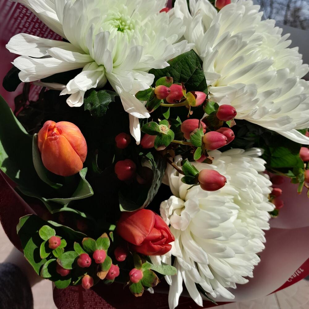 Тюльпан – 2 шт.Лента атласная – 2 шт.Фисташка – 2 шт.Хиперикум – 4 шт.Упаковка дизайнерская – 2 шт.Хризантема Антонов – 3 шт.