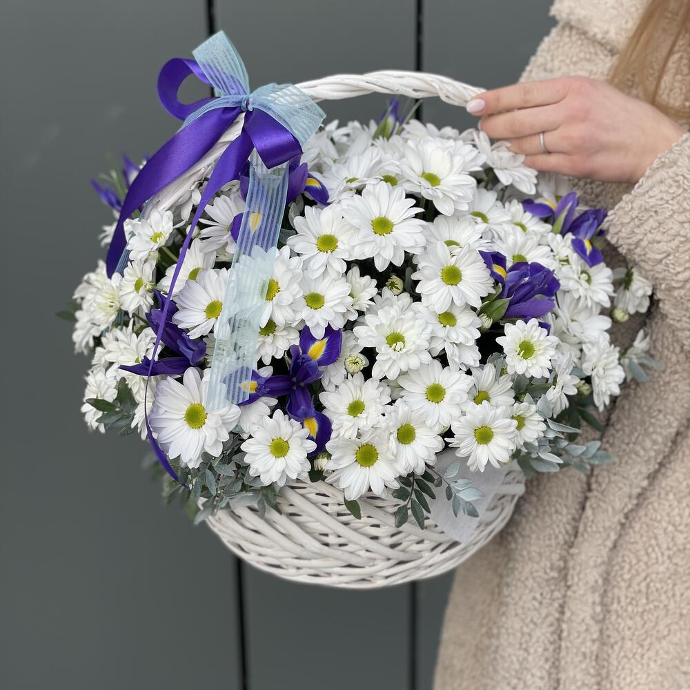 Корзина с белой ромашковой хризантемой и ирисами!