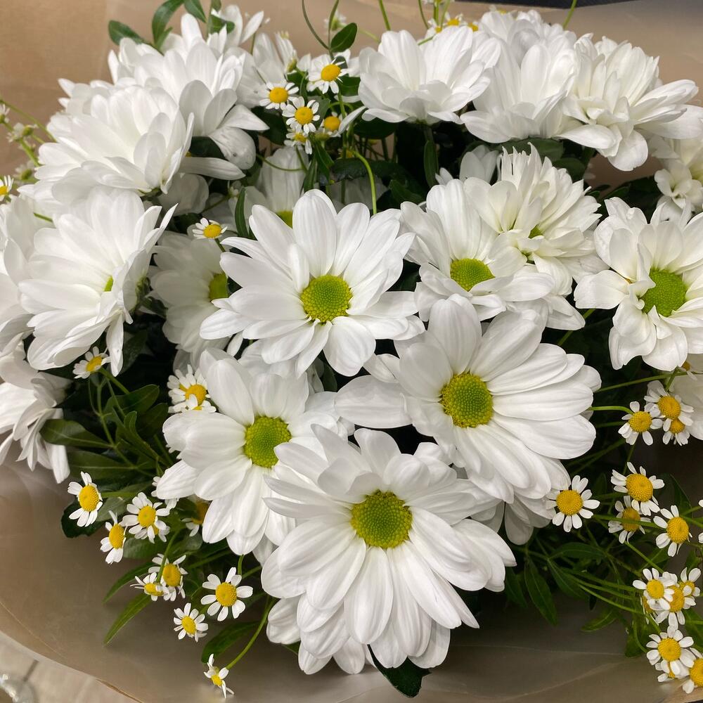 Воздушный букет из белой кустовой хризантемы и легкой голландской ромашки