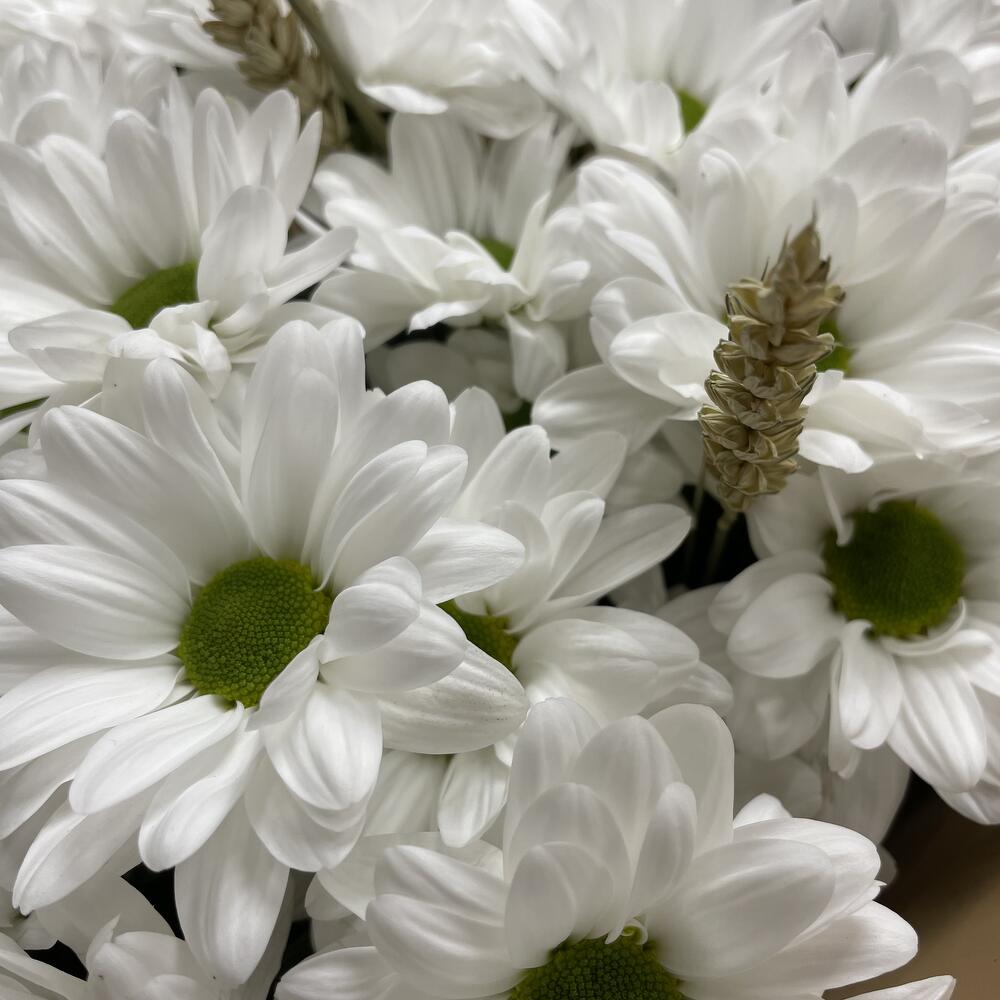 Хризантема кустовая – 11 шт.Колосья – 9 шт.Лента атлас – 1 шт.Пленка матовая – 2 шт.