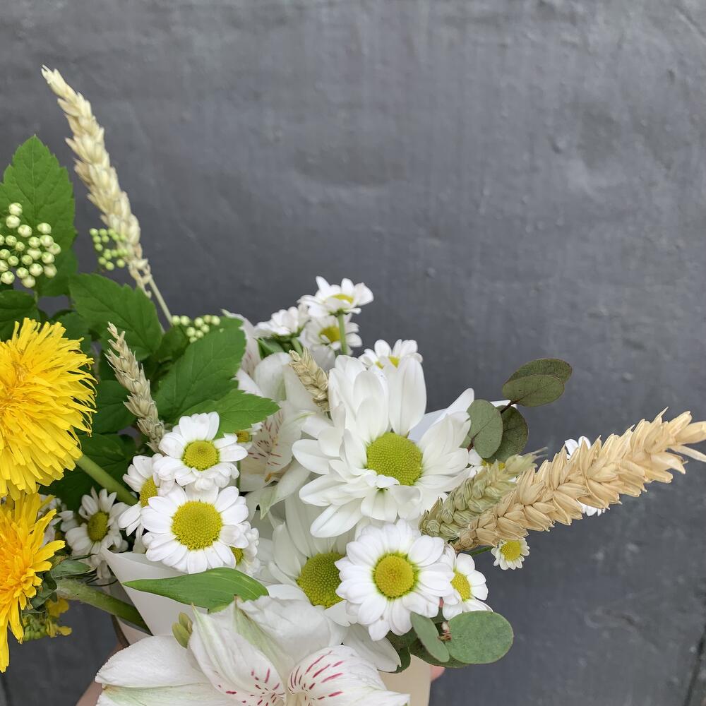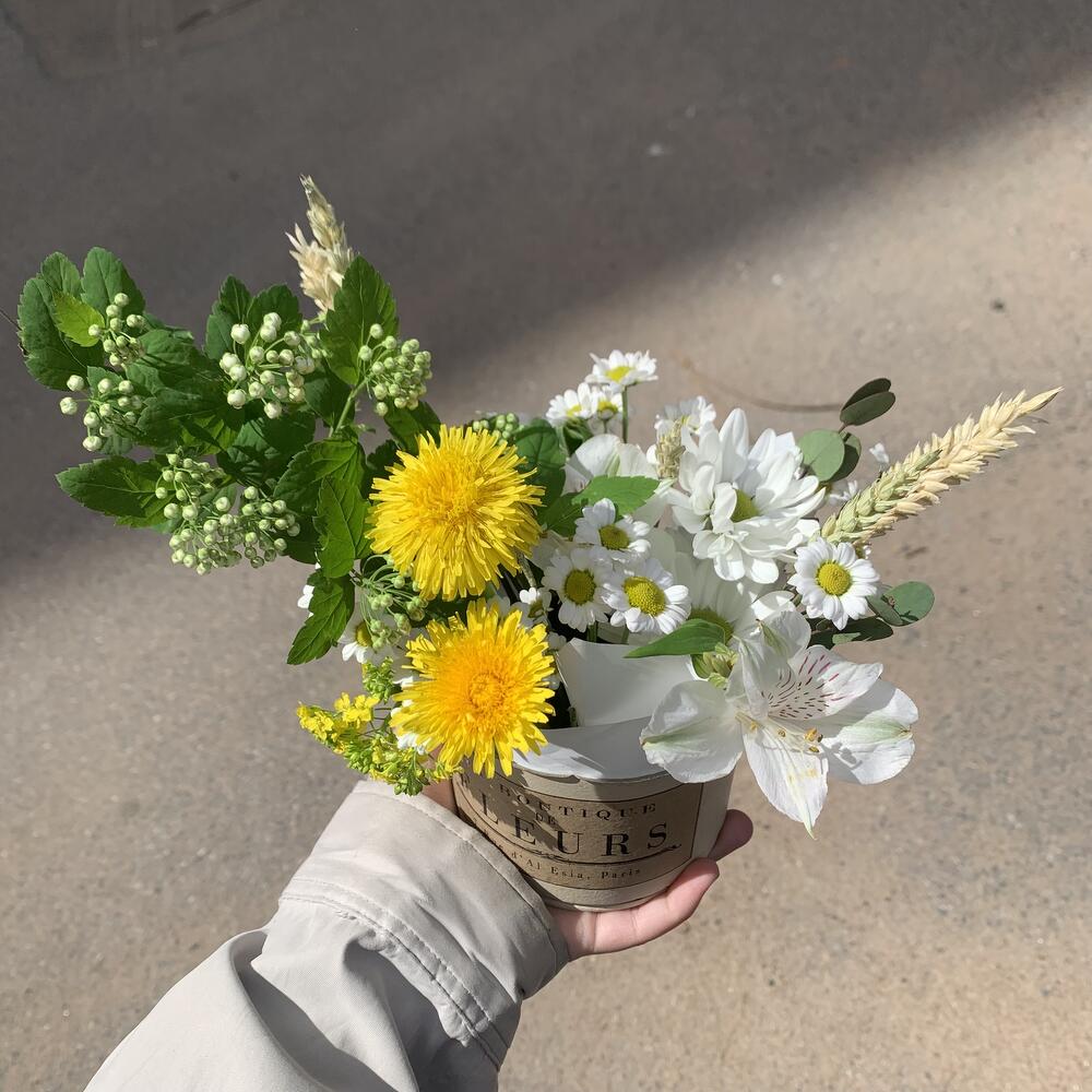 Альстромерия – 1 шт.Хризантема – 1 шт.Кашпо металлическое – 1 шт.Оазис флористический – 1 шт.Одуванчик – 2 шт.
