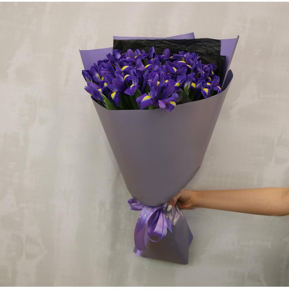 Букет из 35 синих ирисов в стильной упаковке