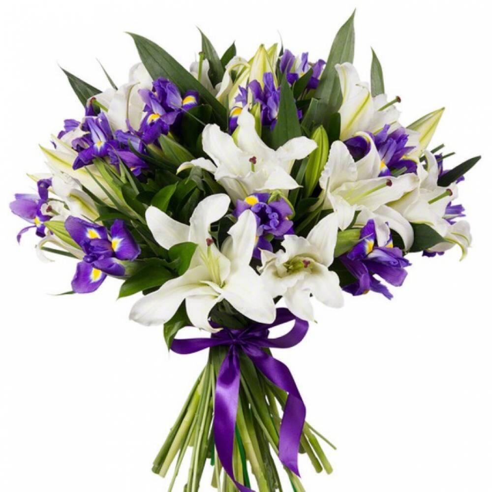 Ирис синий – 20 шт.Лилия белая – 9 шт.Атласная лента – 1 шт.