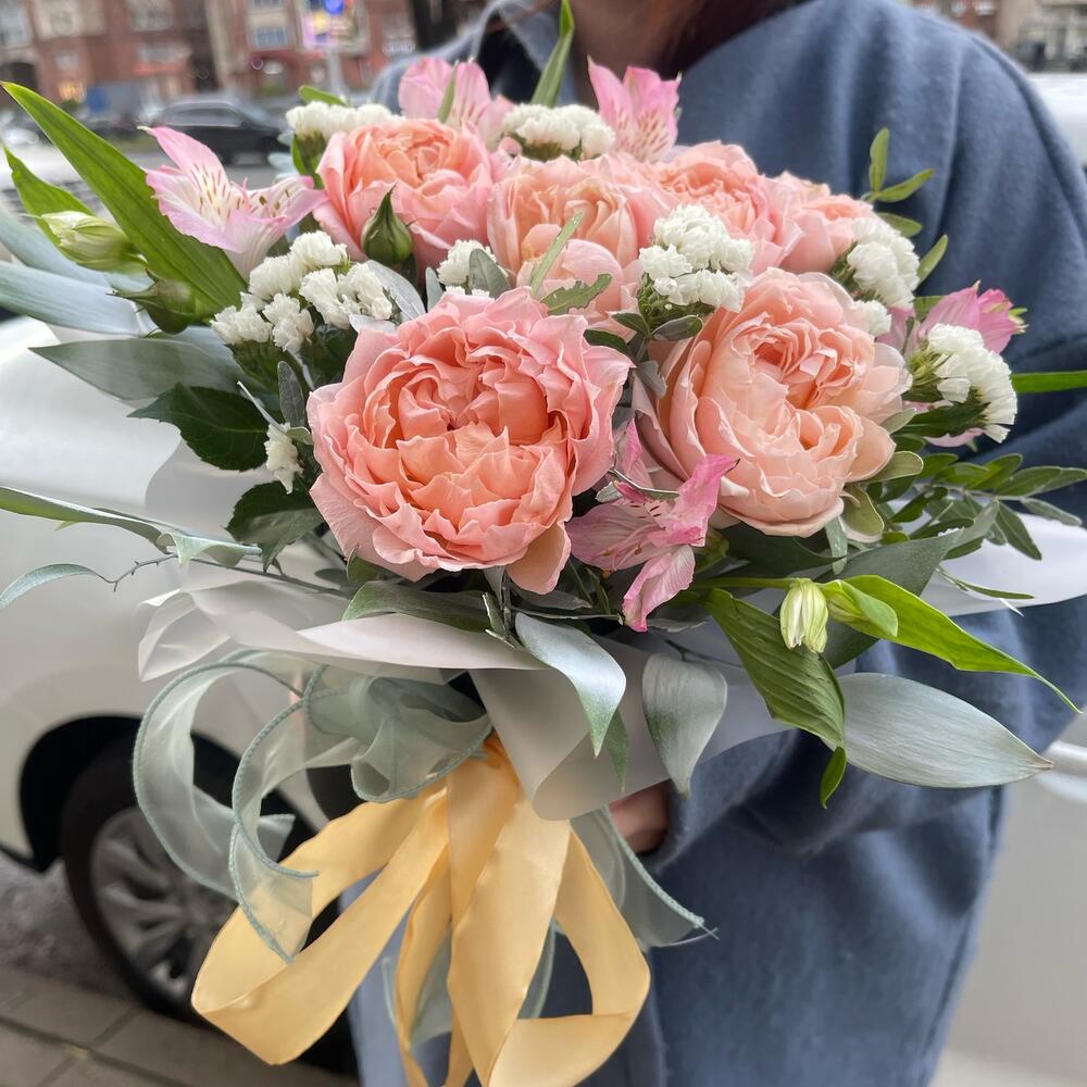 Альстромерия – 1 шт.Статица – 1 шт.Лента атласная – 1 шт.Коробка шляпная – 1 шт.Фисташка – 5 шт.Оазис флористический – 1 шт.роза джульетта кустовая – 2 шт.