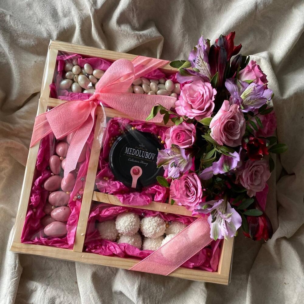 Набор в подарок из орехов в шоколаде, рафаэлло, мeда и роз